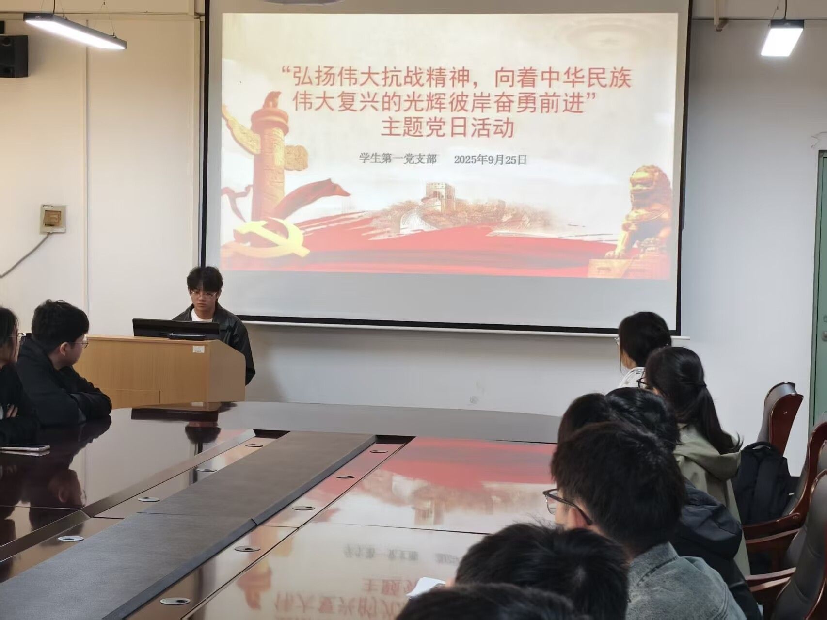 电气工程学院第一学生党支部于2025年9月25日召开“弘扬伟大抗战精神,向着中华民族伟大复兴的光辉彼岸奋勇前行”主题党日活动。此次活动以“学精神、悟内涵、强担当”为核心目标,号召青年党员汲取历史力量。