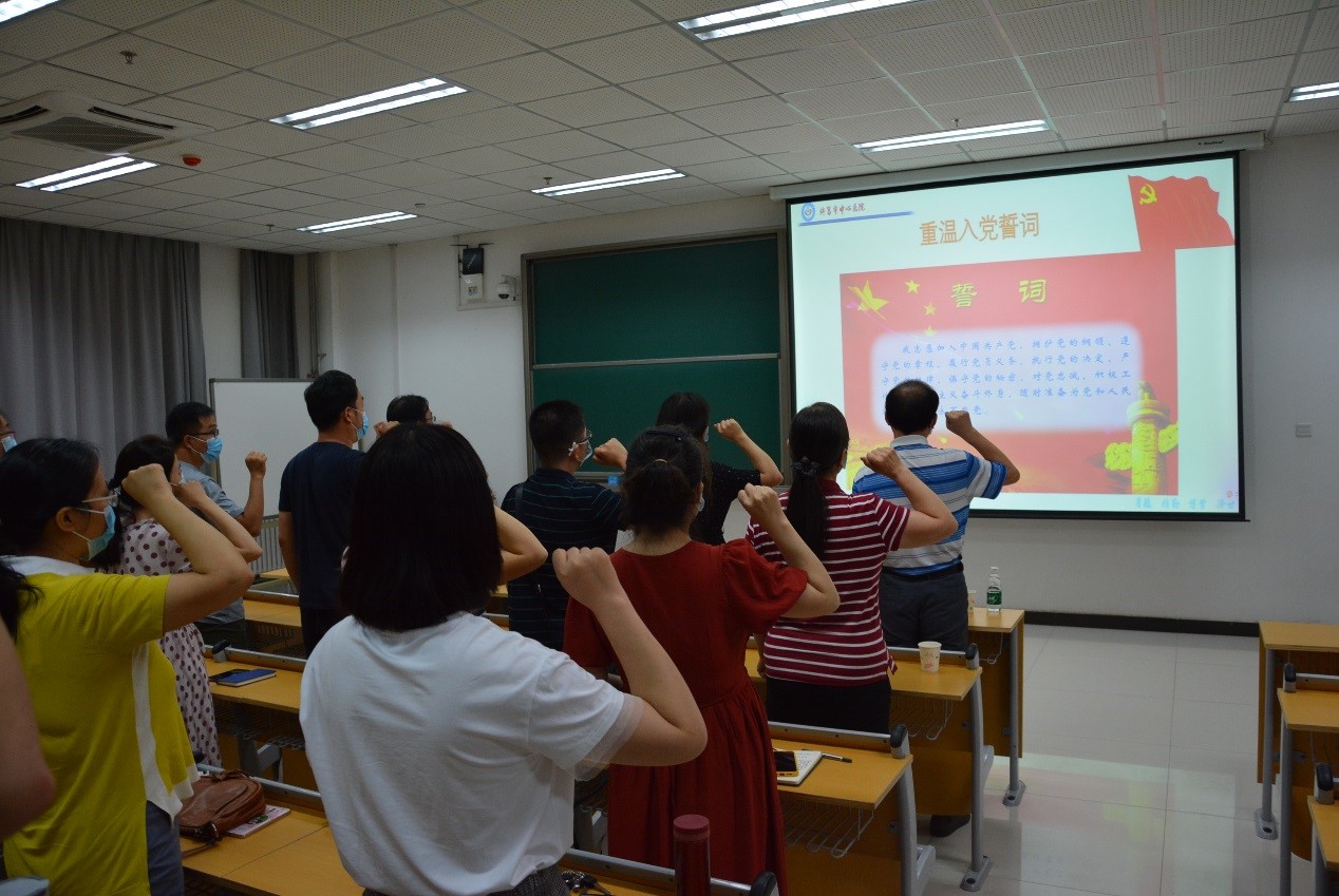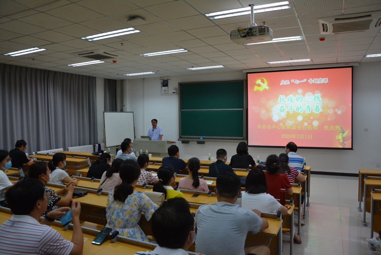 为庆祝中国共产党成立99周年,7月1日,院党委特别邀请许昌市中心医院副主任医师张庆辉,围绕“抗疫的一线、奋斗的青春”,上了一堂专题党课。党委书记高凯主持党课,领导班子成员及党员教师70余人聆听了这场专题党课。