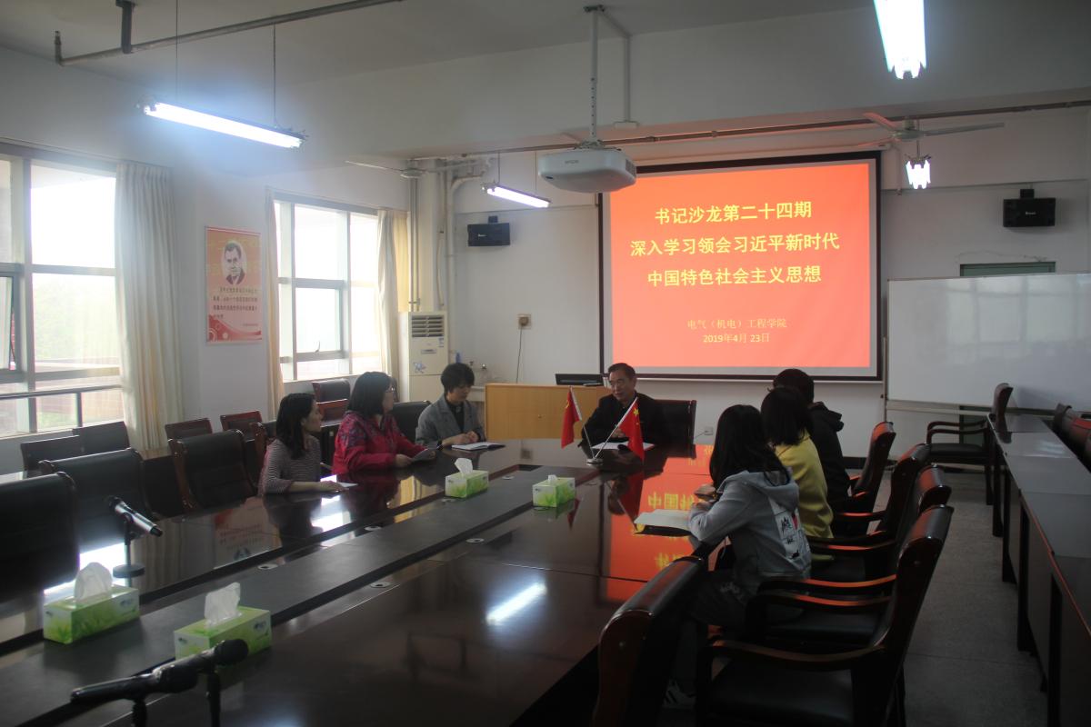 2019年4月23日,书记沙龙第二十四期在综合实验楼三楼会议室召开,此次书记沙龙围绕深入学习领会习近平新时代中国特色社会主义思想的科学理论体系展开专题学习。电气(机电)工程学院党总支书记李新生、党总支副书记白晓玉以及全体教工、学生支部书记参加了此次专题学习讨论会。