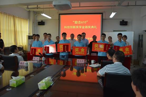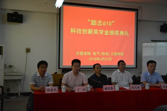 院党总支书记李新生宣读了《电气(机电)工程学院2017-2018学年“励志610”科技创新奖学金表彰决定》,钦惺、刘艳广、喻超、秦高将、李楷、张飞翔等获得奖励。一等奖获得者钦惺结合自己的学习经历、科技竞赛和创新感悟,发表了获奖感言。