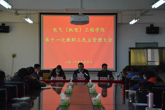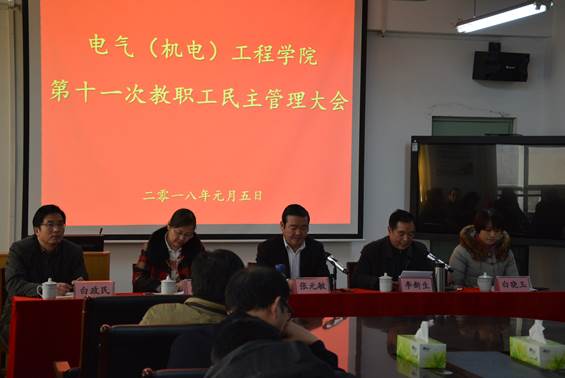 院长张元敏同志作了题为《全面贯彻学习党的十九大精神 高水平 全方位 推进电气(机电)工程学院发展》的行政工作报告。报告主要从2017年工作回顾,2018年学院面临的形势和任务两个方面向大会进行汇报。