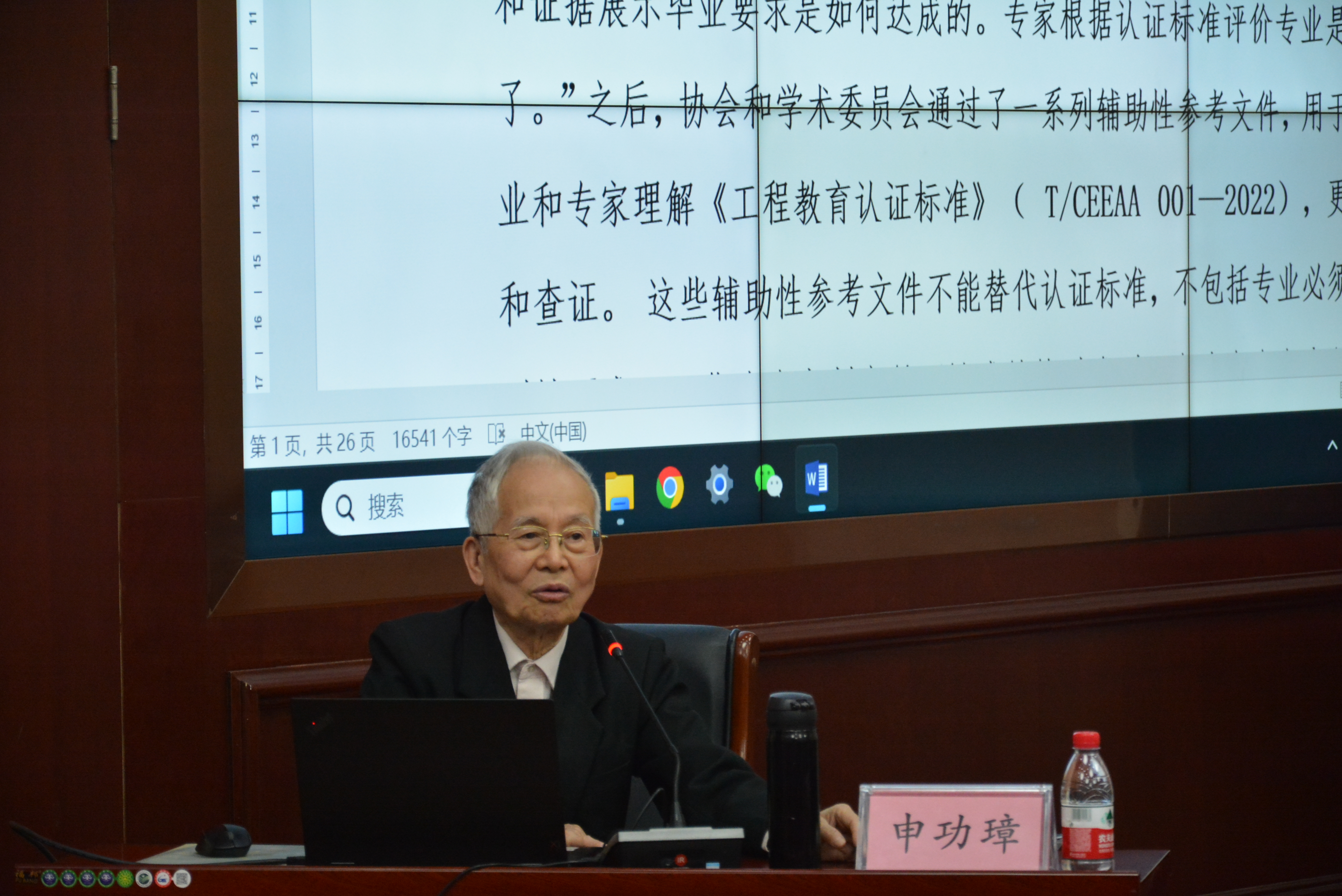 在历时3个半小时的时间里,申功璋教授从“对2021版《华盛顿协议》标准的理解与研讨、标准解读及使用指南落实华盛顿协议标准、对认证标准体系及指标的若干问题思考、学习《高等学校课程思政建设指导纲要》体会”等四大方面对工程教育认证问题进行了分析说明。申教授从工程教育专业认证标准毕业要求、《毕业要求和职业胜任力框架》修订、2022版《标准解读》、立足当下聚焦面向产出的“主线和底线”、课程思政内涵与认证的毕业要求关系等方面进行了详细、深入地解读。