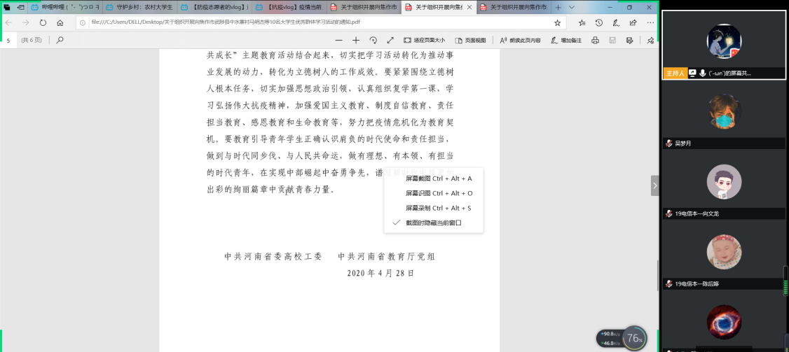 为深入学习贯彻习近平总书记给北京大学援鄂医疗队全体“90后”党员回信精神,学习先进事迹,弘扬主旋律、传播正能量。5月10日,我院积极响应省委高校工委、省教育厅的工作部署,组织全体学生开展了向“焦作市武陟县中水寨村马明杰等10名大学生优秀群体”学习的主题活动。