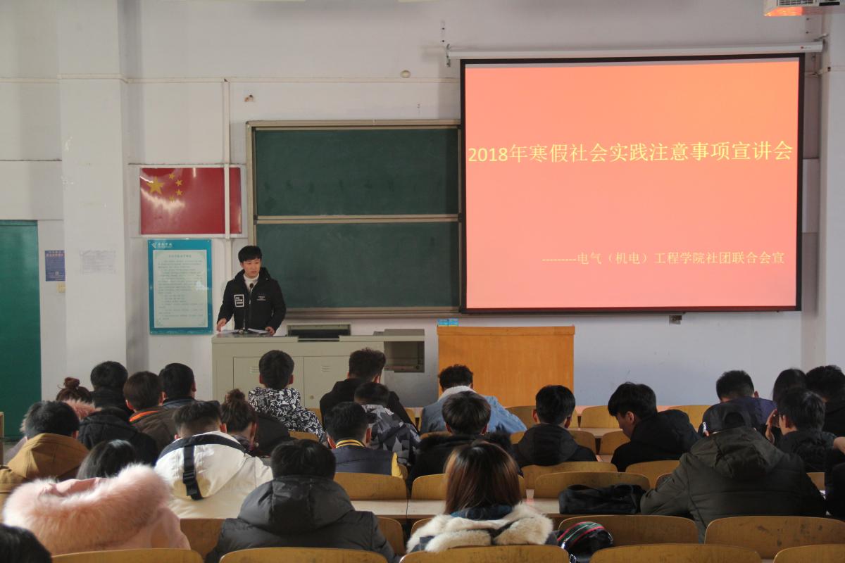 为学习宣传贯彻党的十九大精神以及习近平总书记关于青年成长成才的一系列重要论述,进一步贯彻落实团中央《中长期青年发展规划(2016—2025年)》精神,引领和帮助广大青年学生在社会实践中受教育、长才干、作贡献,电气(机电)工程学院于1月5日下午三点在A合五教室宣讲寒假社会实践具体内容及各项要求,本次会议由各年级班级代表参加。