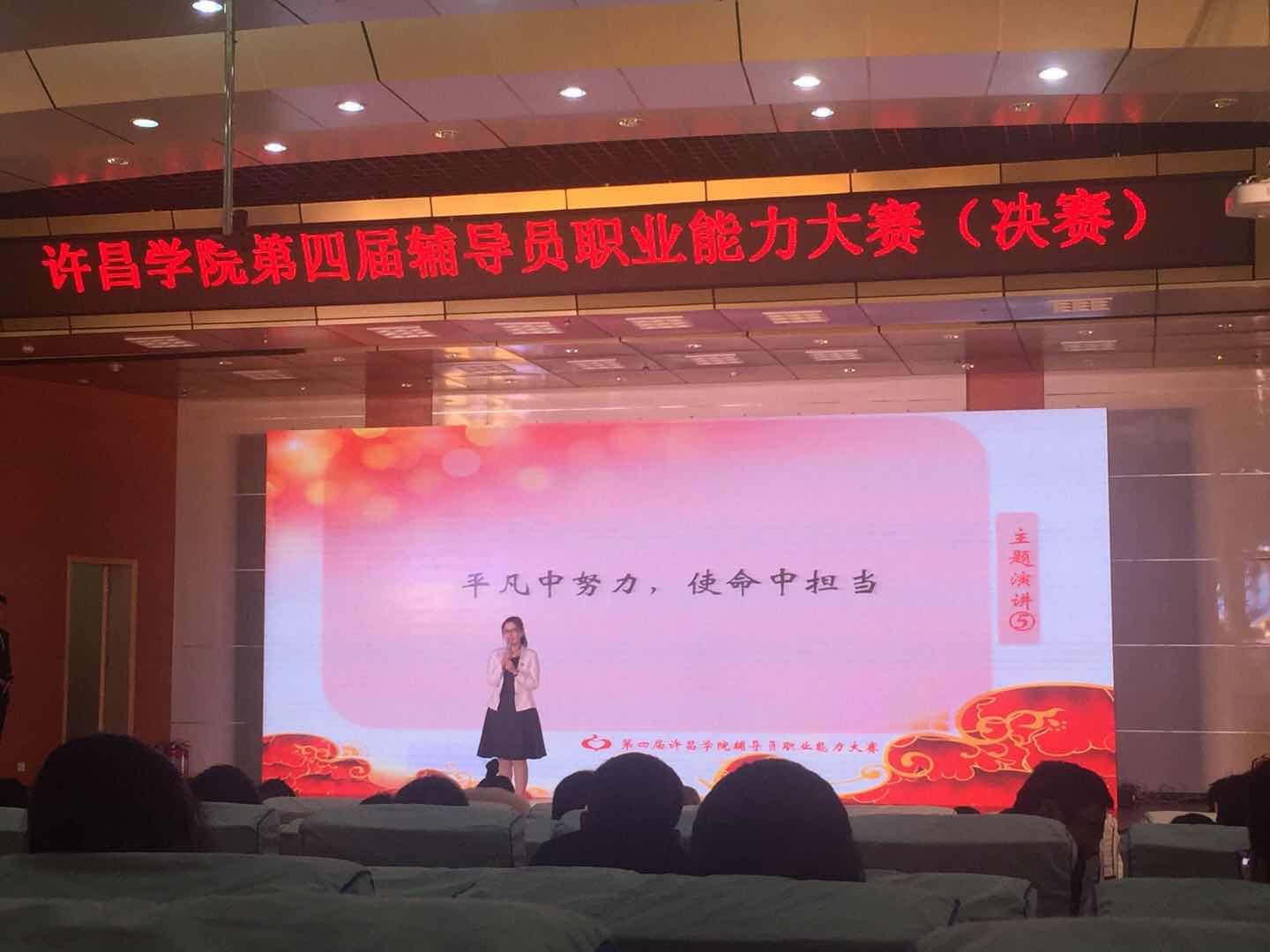 2017年1214日下午,第四届辅导员职业能力大赛决赛在学术报告厅举行。校党委副书记孙海出席比赛现场,各学院党总支书记、副书记、全体辅导员及学生代表300余人一同观看了比赛。经过初赛、复赛、决赛三个阶段的激烈角逐,我院辅导员平志惠老师凭借扎实的理论基础和丰富的实践经验,表现优异,斩获桂冠,我院喜获优秀组织单位。