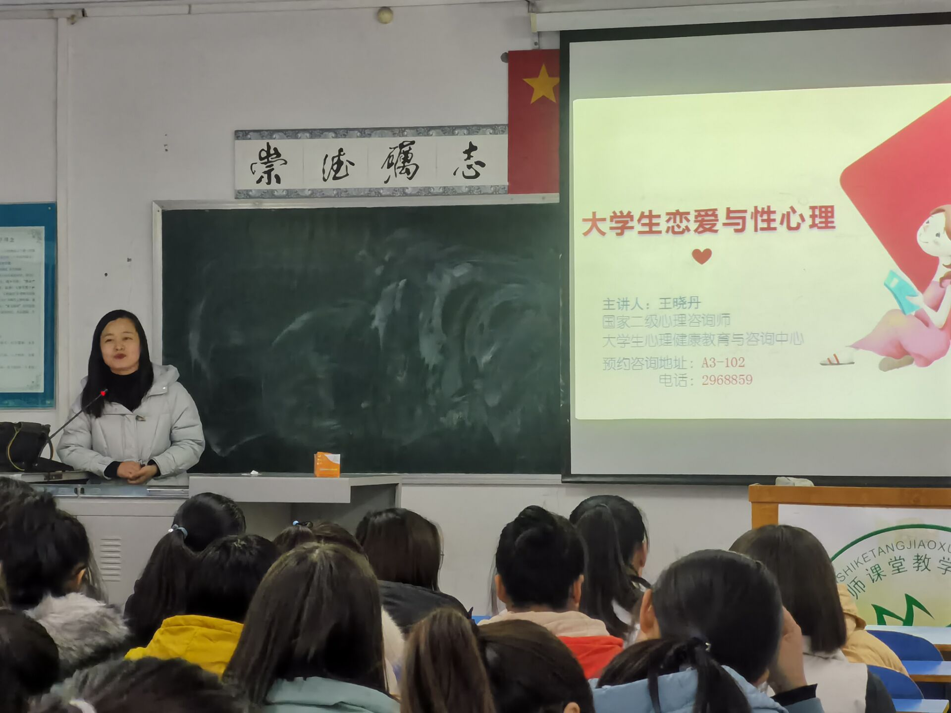 为进一步贯彻教育部《高等学校学生心理健康教育指导纲要》,加强我院学生管理和心理健康教育工作,12月17日,我院在启智楼C-202举办主题为“大学生恋爱与性心理”大学生心理健康教育讲座。讲座由王晓丹老师主讲,我院全体女生参加。