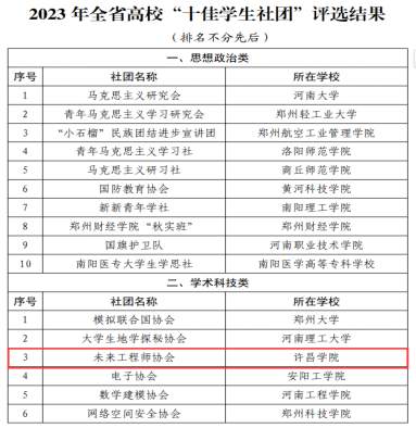 近日,2023年全省高校“十佳学生社团”评选结果公布,我院“未来工程师协会”荣获“十佳学生社团”称号。