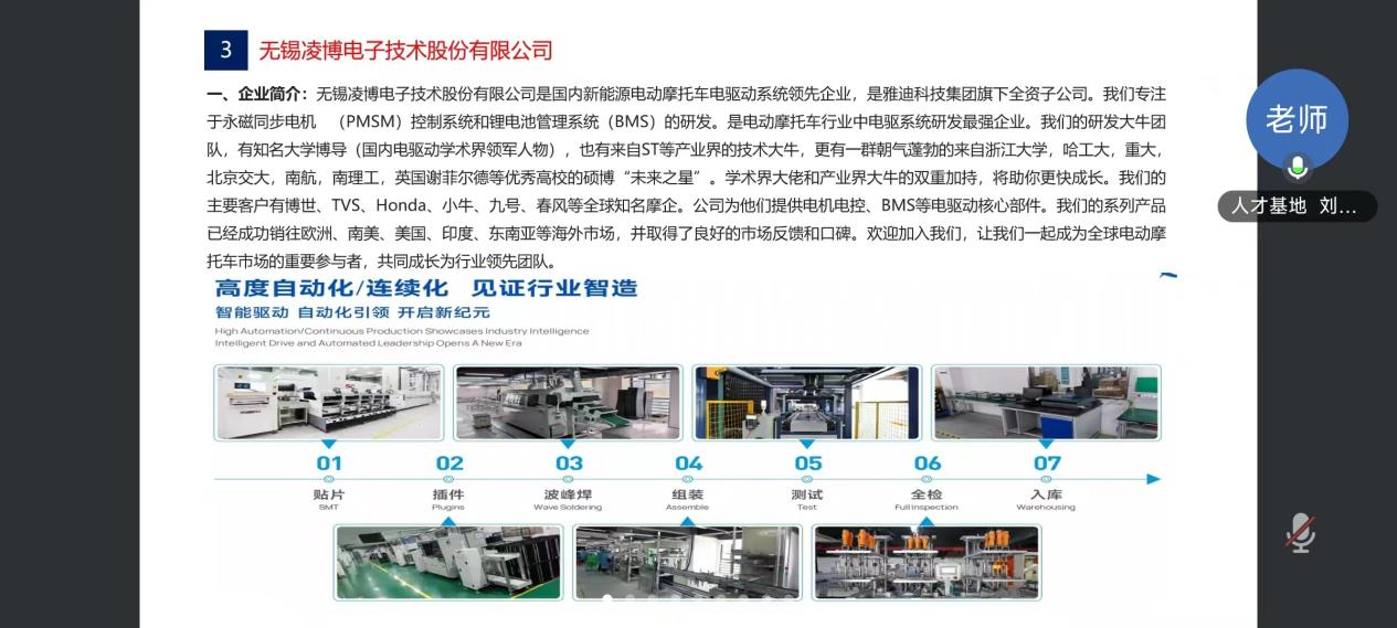 我院对此次招聘会高度重视,提前与企业进行了深入沟通,确保招聘会顺利进行。通过腾讯会议平台,企业HR与学生进行实时互动,企业HR介绍无锡产业人才创新基地,并通过直播宣讲、在线答疑等形式,详细介绍企业文化、工作环境、工作内容、人才培养、福利待遇等,分享了行业发展趋势和职业发展建议,为我院学生提供了宝贵的参考。会后,企业建立了与学生“面对面”交流的微信群,同学们表示非常感谢学院提供的宝贵机会。
