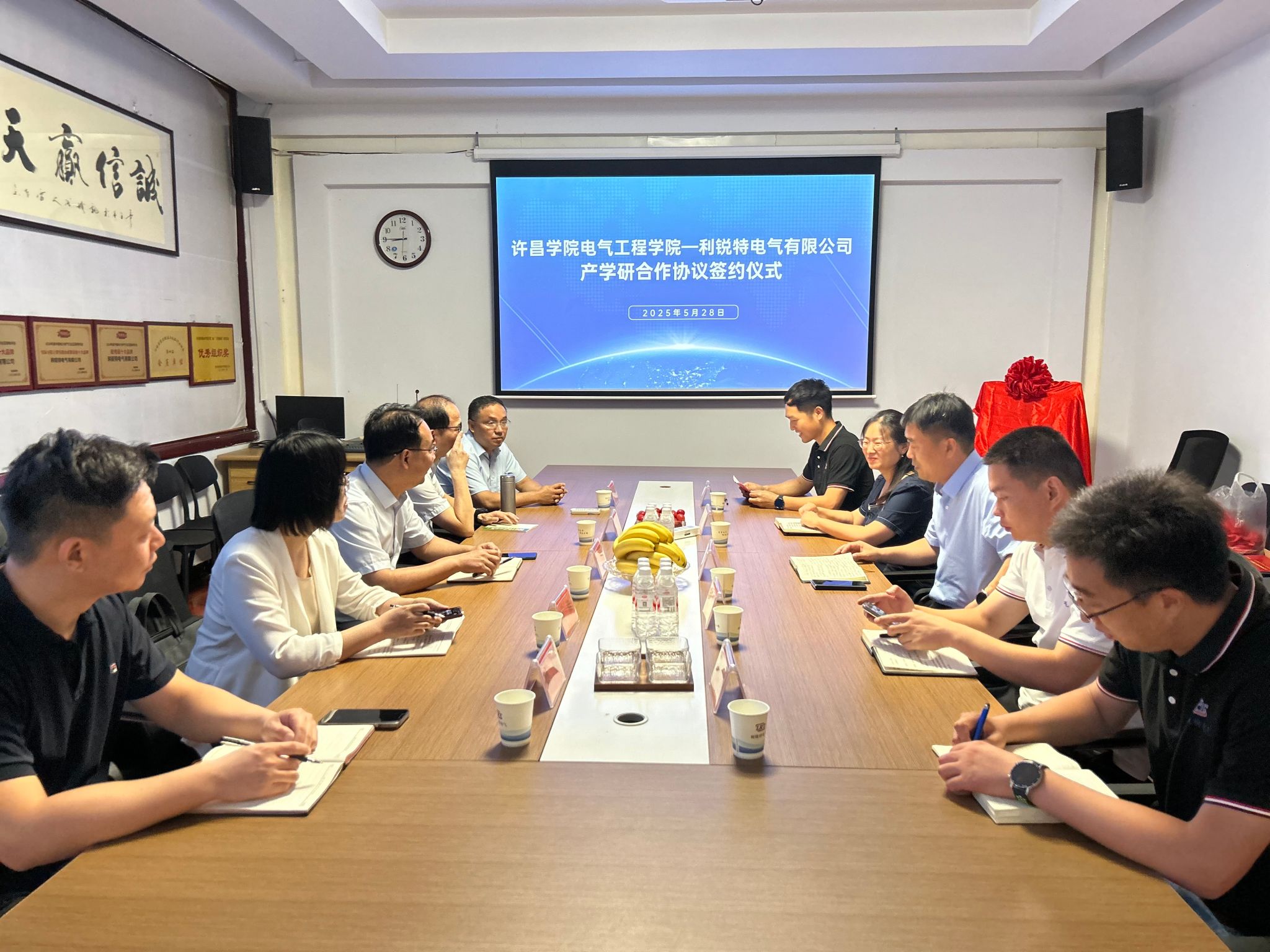 2025年5月28日,我院到河南利锐特电气有限公司开展访企交流,双方签订产学研合作协议,并在公司揭牌建立电气工程学院产学研合作基地。院党委书记高凯、副院长(主持工作)方如举、副院长周雅及利锐特公司总经理王三元、副总经理姜志娜等参加活动。